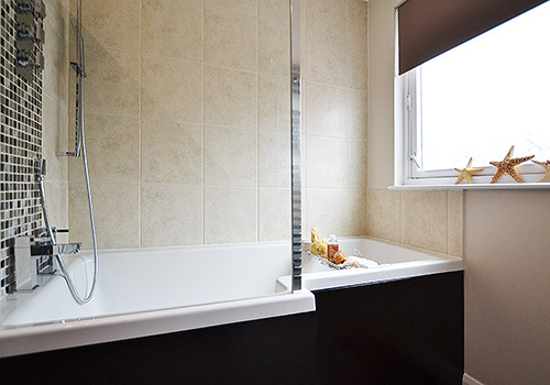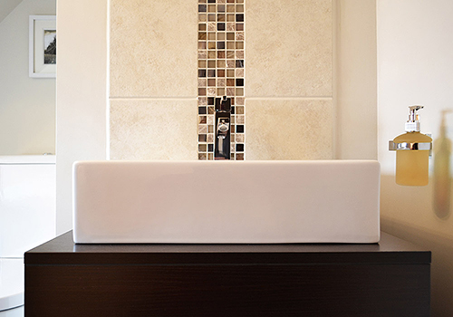 The wet areas have been finished with large beige Ceramic Wall Tiles, which have been complimented with contrasting modern Mosaic feature tiles, in a mixture of glass and natural stone, in a variety of natural beige and brown shades.