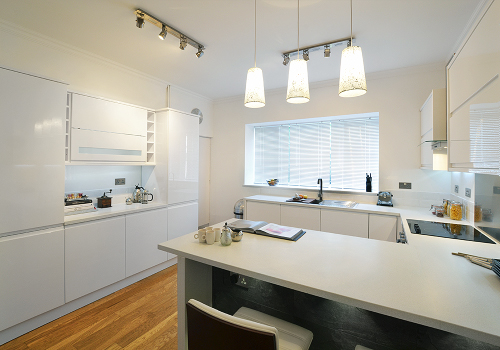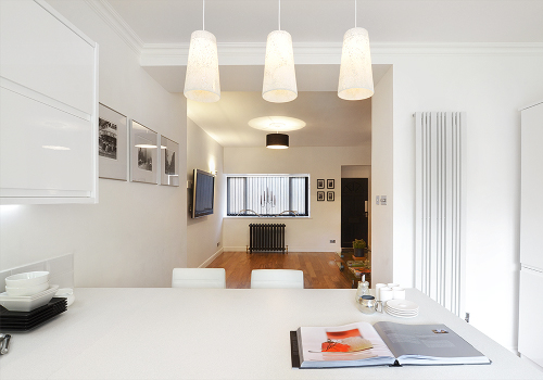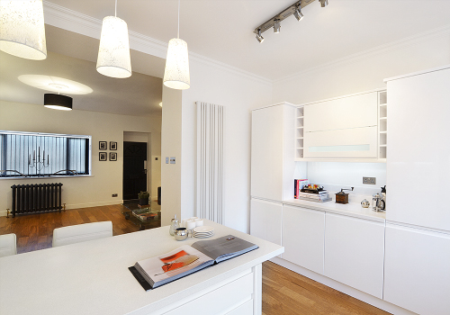 Other fixtures include a fabulous designer Vertical Radiator, in a matt white finish, complete with Chrome Valves. The Radiator is rated at approximately 4,435 BTUs or 1300 Watts. The Kitchen Window features a lovely deep ledge and has been fitted out with three Venetian Blinds, rather than one large Venetian Blind. This is a far more practical approach in terms of functionality. A white gloss finish was chosen to coordinate with the Kitchen Units and Wall Tiles.